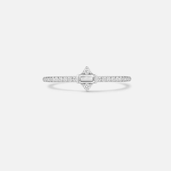 Les diamants taille baguette dessinent des lignes épurées, tandis que les brillants en révèlent le rythme et l’éclat.