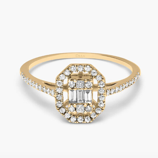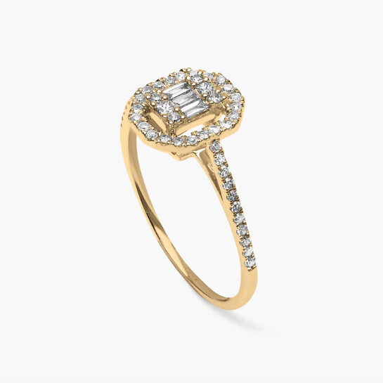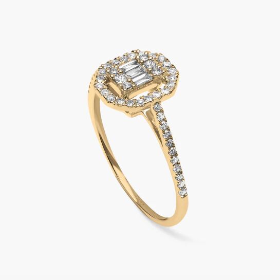 Cette composition de 9 diamants, totalisant 0,49 carat, est magnifiée par un serti griffes délicat qui laisse la lumière danser librement.