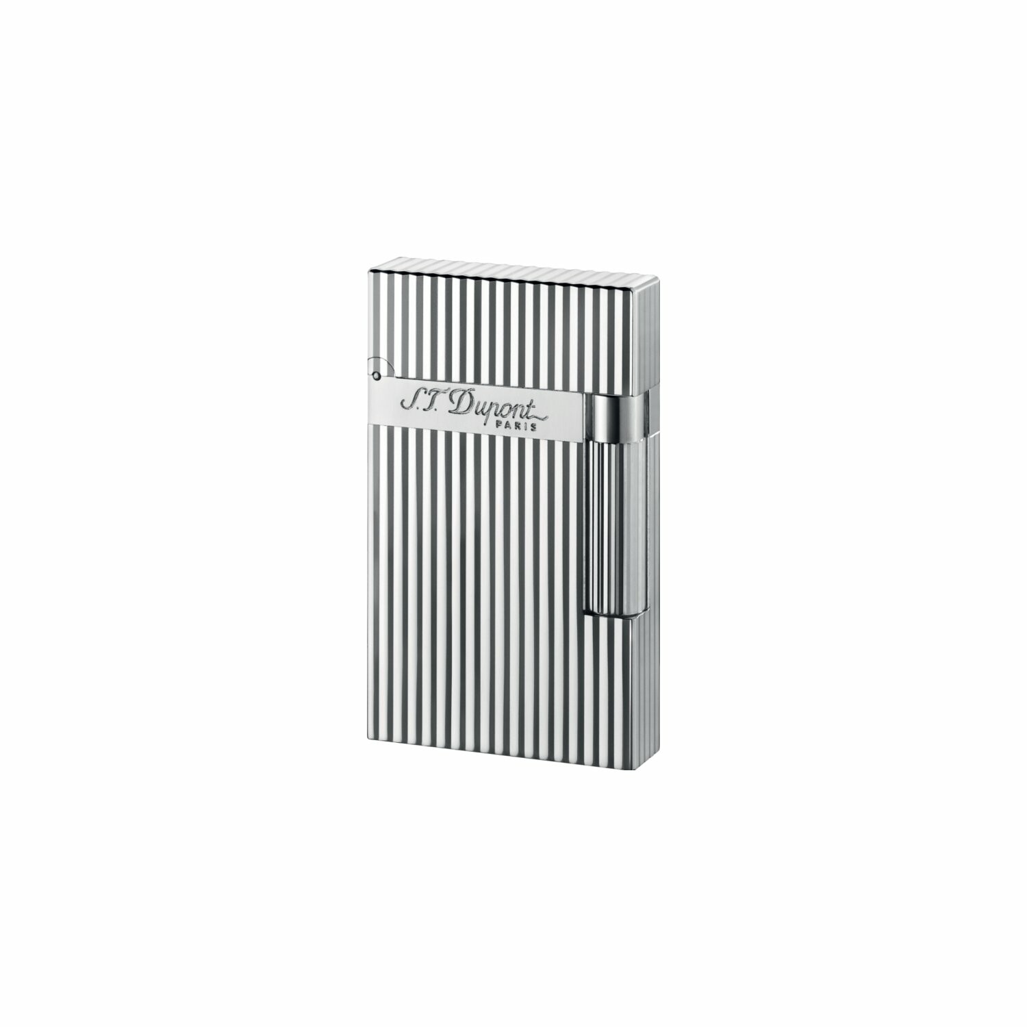 D'une élégance classique, ce briquet est décoré avec un guilloché vertical et une finition en argent.