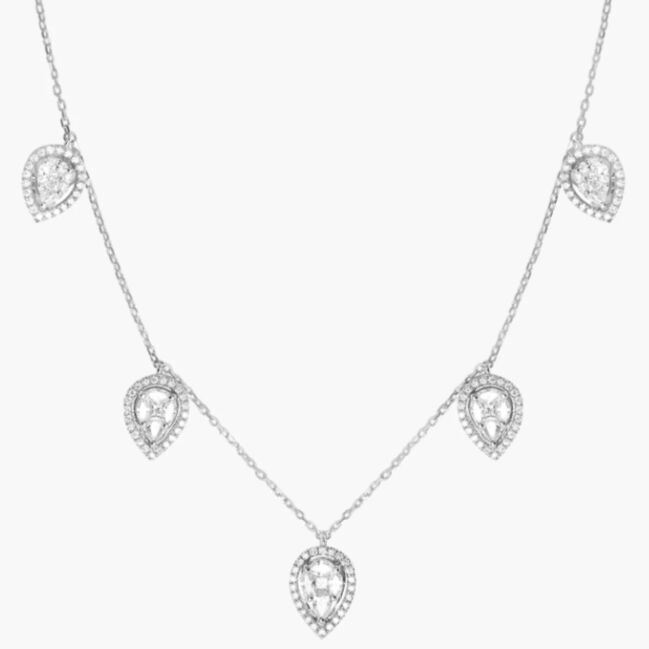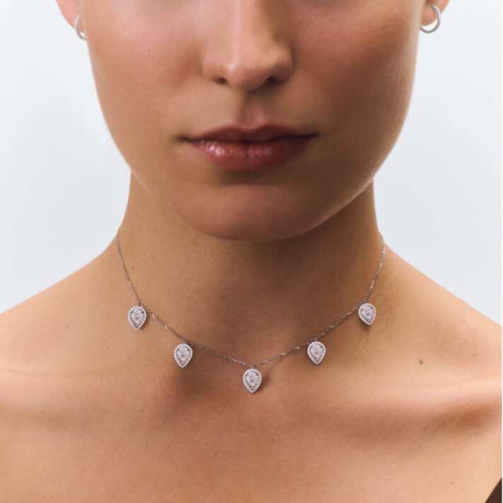 Véritable hommage à l’éclat éternel de la Ville Lumière, le Choker Éclat en or 750/1000 capture toute la magie de Paris dans une création d'une pureté absolue. Cette pièce d'exception se distingue par ses cinq pampilles de diamants taille poire, sublimées par une technique de serti illusion unique :