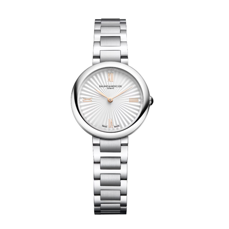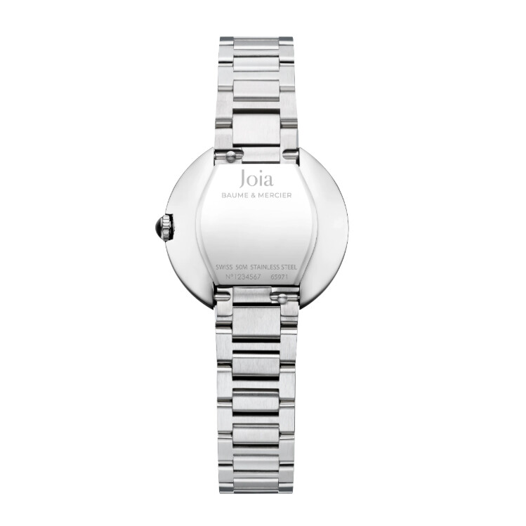 La Joia de Baume & Mercier (réf. 10848) se présente dans un boîtier rond de 28 mm en acier poli, à l’élégance sobre et intemporelle.
