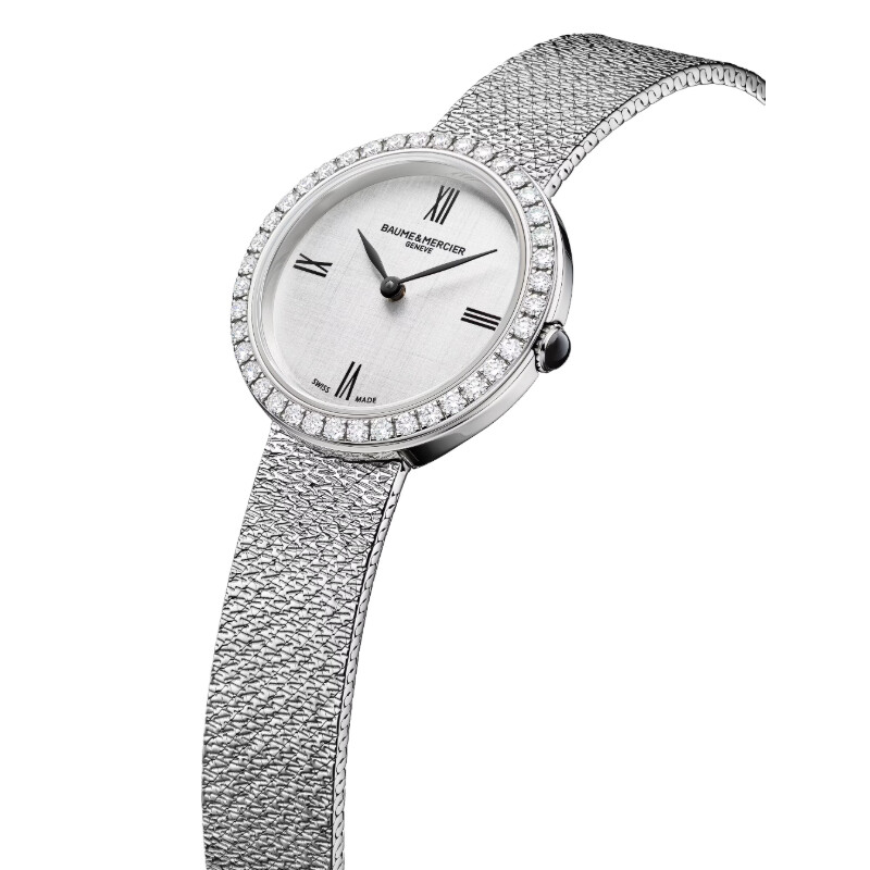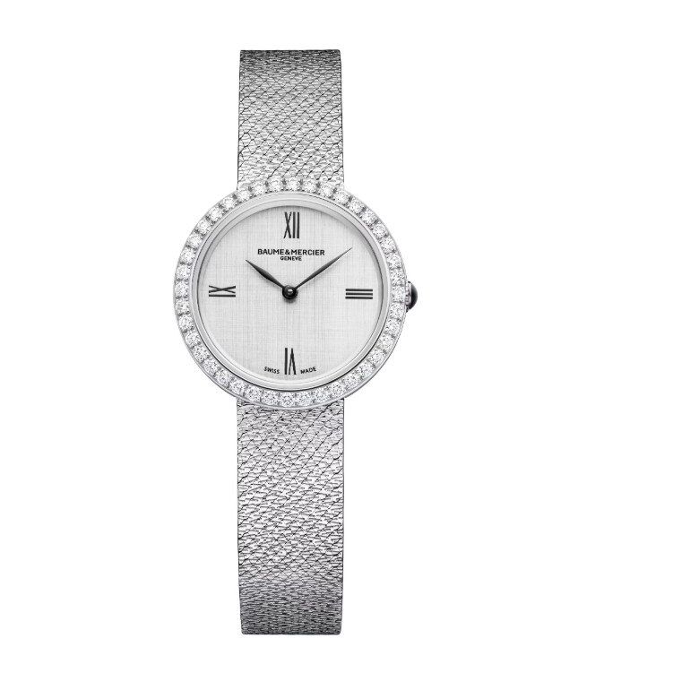 La Joia de Baume & Mercier (réf. 10850) est une montre féminine élégante au boîtier rond de 28 mm en acier poli, serti de 40 diamants pour une touche lumineuse et raffinée.
