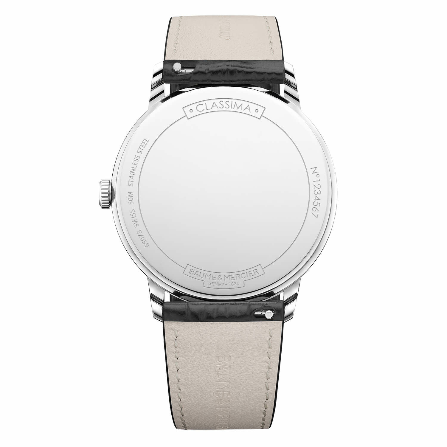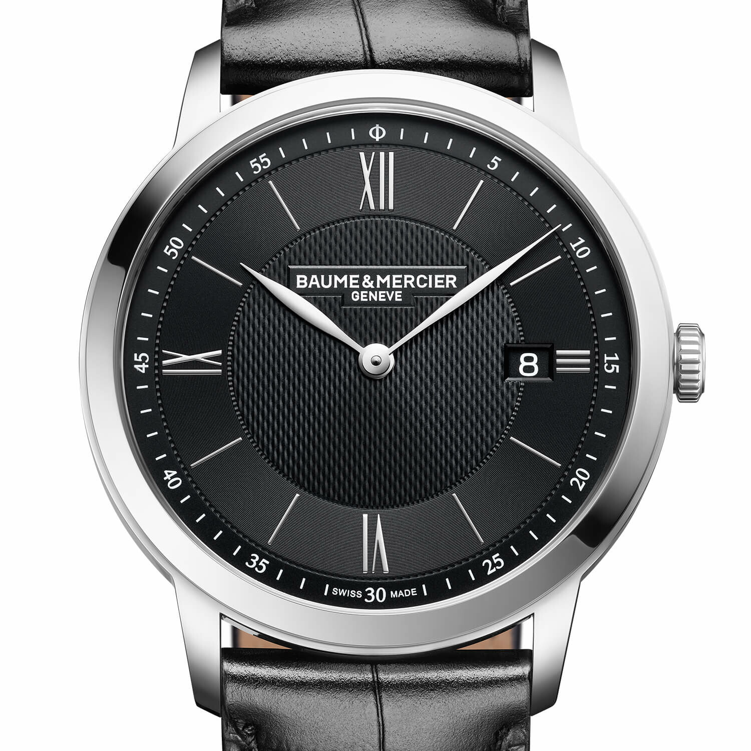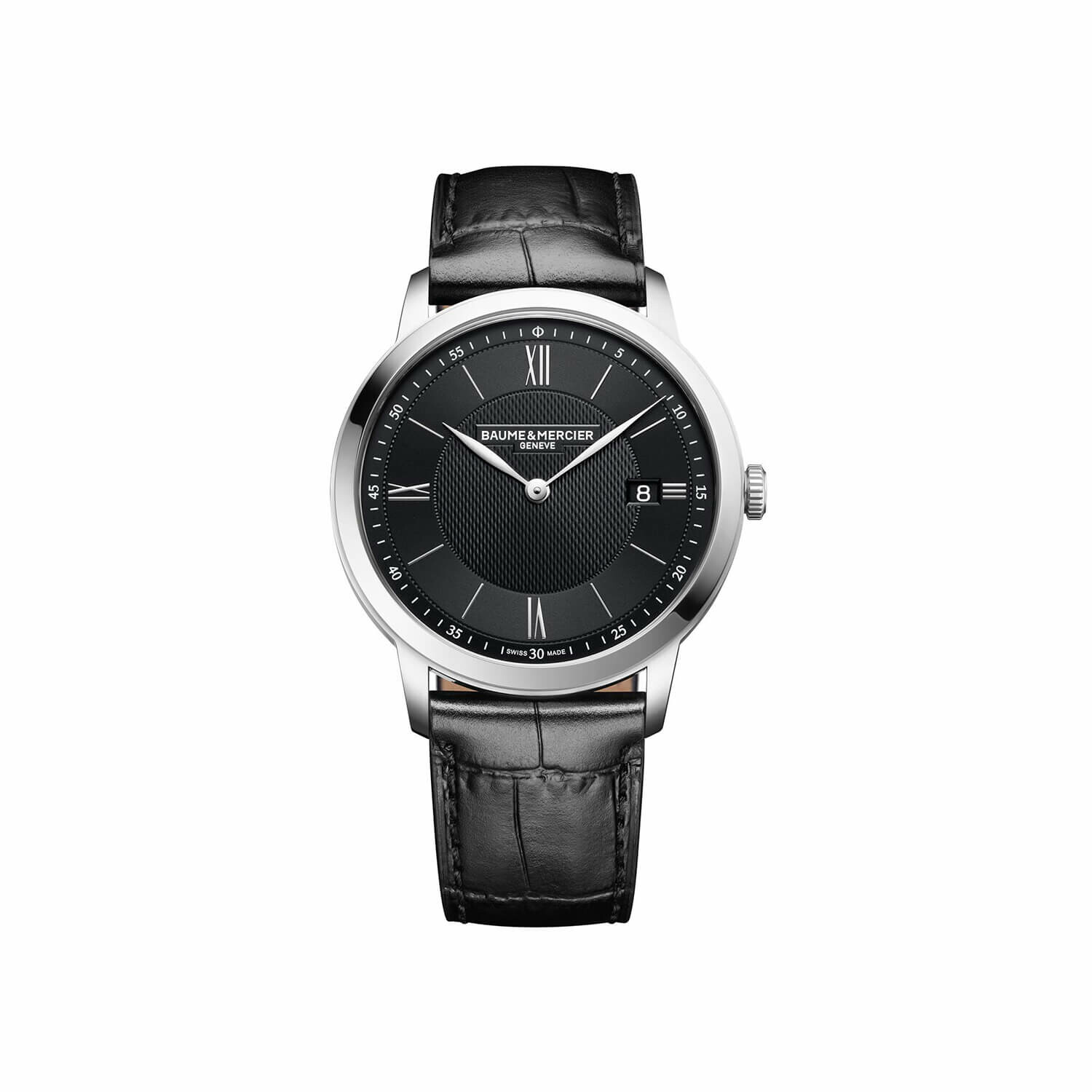 La Baume & Mercier Classima 10881 se distingue par son boîtier en acier poli de 40 mm et son élégance sobre. Son cadran noir satiné soleil, orné d’un décor grain d’orge, met en valeur chiffres romains, index et aiguilles feuilles rhodiés, avec date à 3 heures.