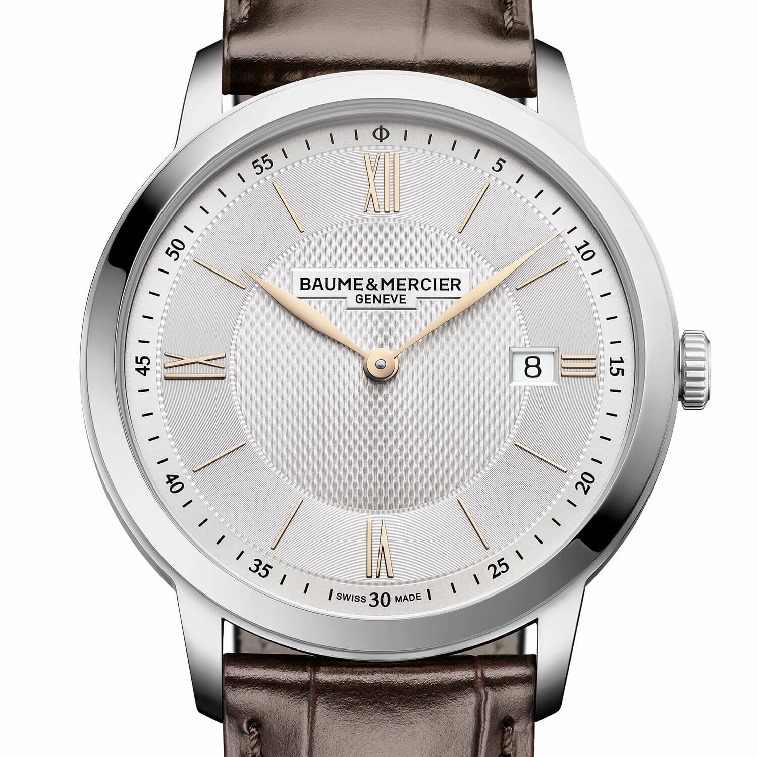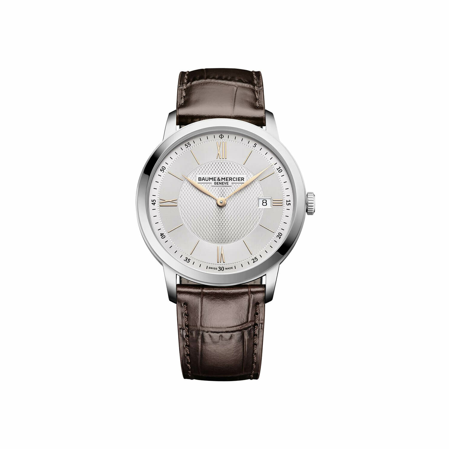 La Baume & Mercier Classima 10882 se distingue par son boîtier en acier poli de 40 mm et son allure élégante. Son cadran opalin argenté satiné soleil, décoré d’un motif grain d’orge, met en valeur chiffres romains et aiguilles feuilles dorés 4N, avec date à 3 heures.