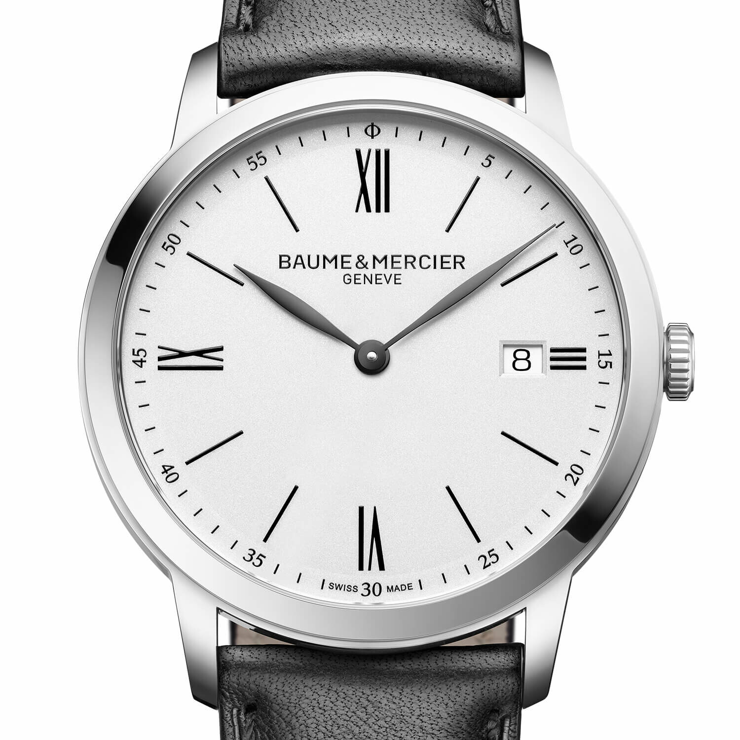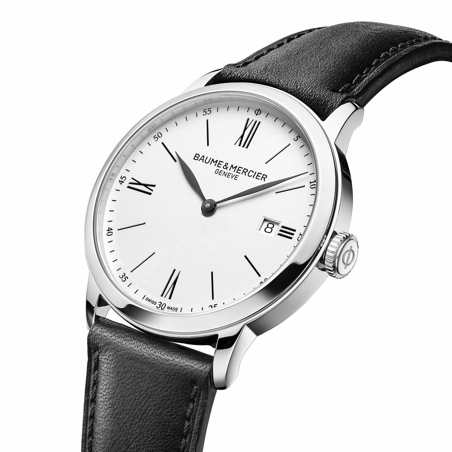 La Baume & Mercier Classima réf. 10884 séduit par son élégance intemporelle et son design épuré. Son boîtier en acier poli de 40 mm s’associe à un cadran opalin blanc argenté avec chiffres romains, aiguilles feuilles en ruthénium et date à 3 heures.