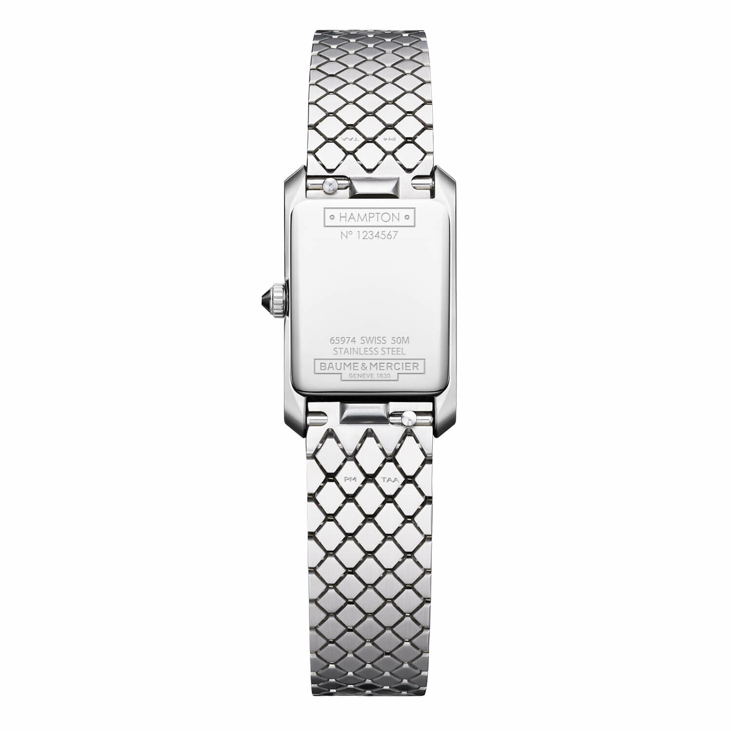 La Baume & Mercier Hampton 10860 se distingue par son boîtier rectangulaire en acier poli au format mini, incarnant une élégance contemporaine et raffinée. Sa couronne sertie d’agate noire et son fond fermé en acier poli soulignent son souci du détail.