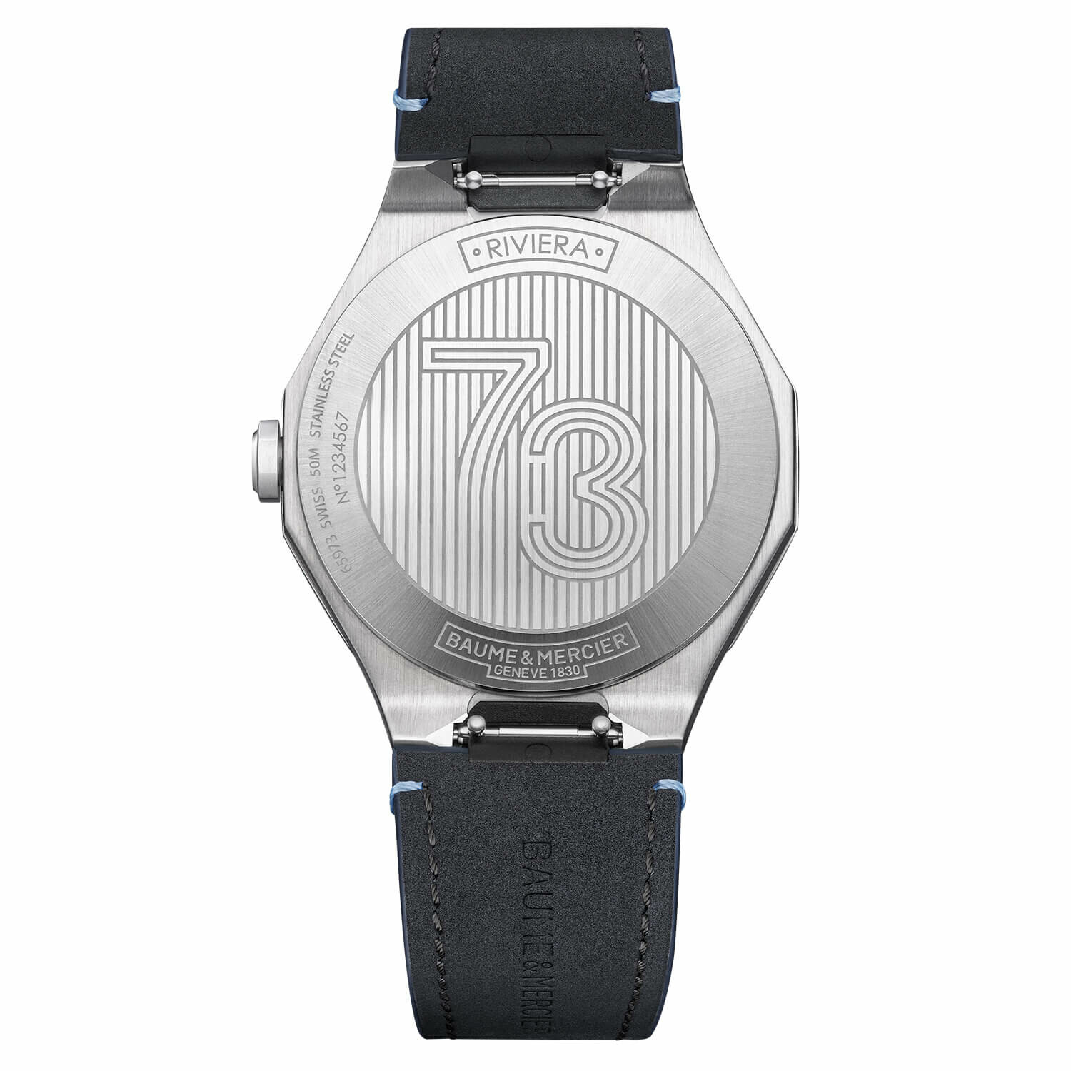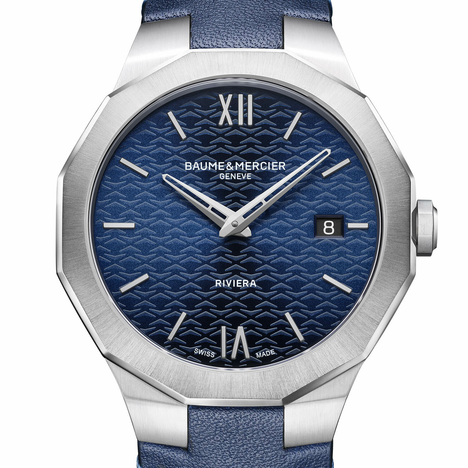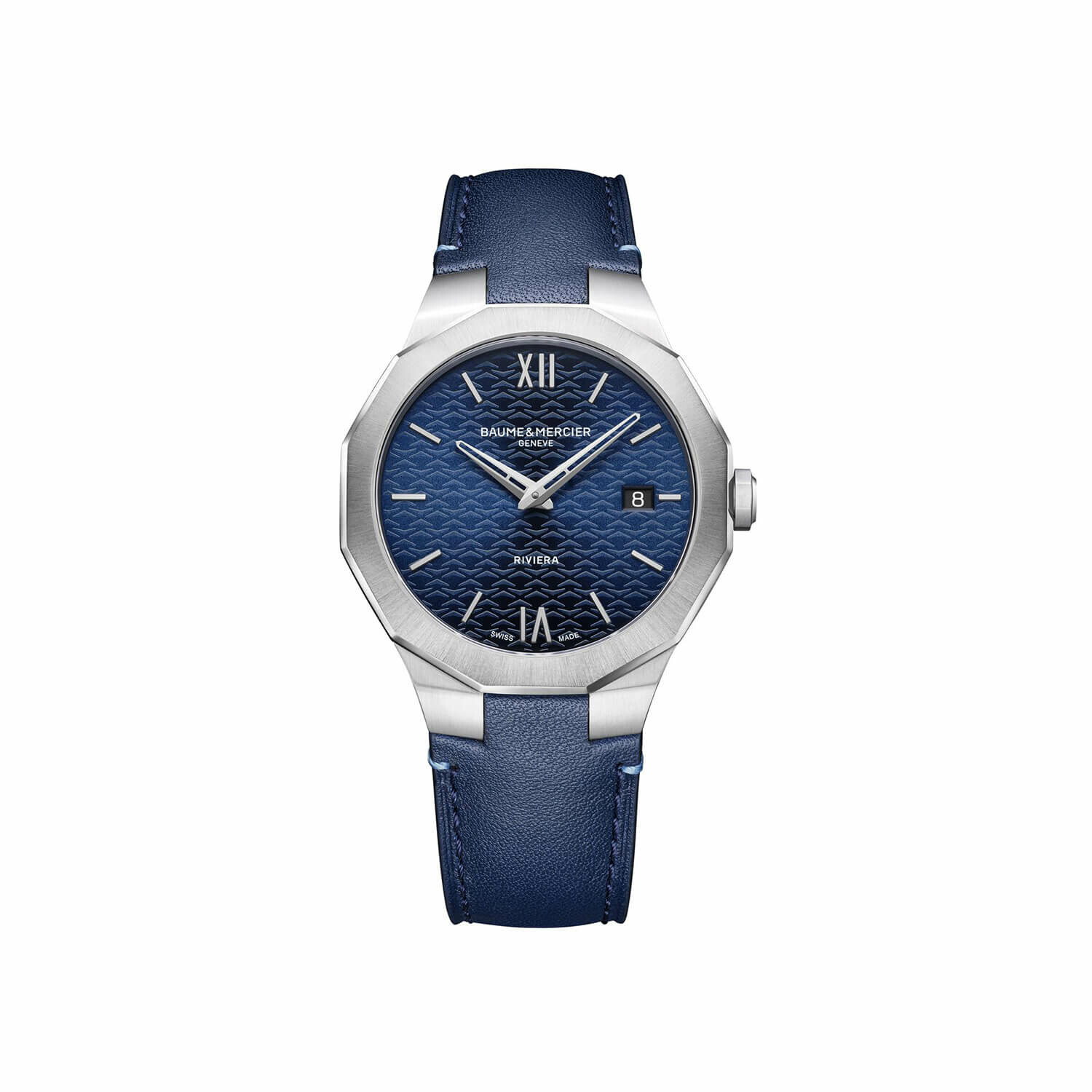 La Riviera 10846 de 39 mm se distingue par son boîtier dodécagonal sans vis, en acier poli-satiné, protégé par un verre saphir traité antireflet. Son cadran bleu satiné soleil, orné du décor vagues, met en valeur des index et chiffres romains rivetés rhodiés.