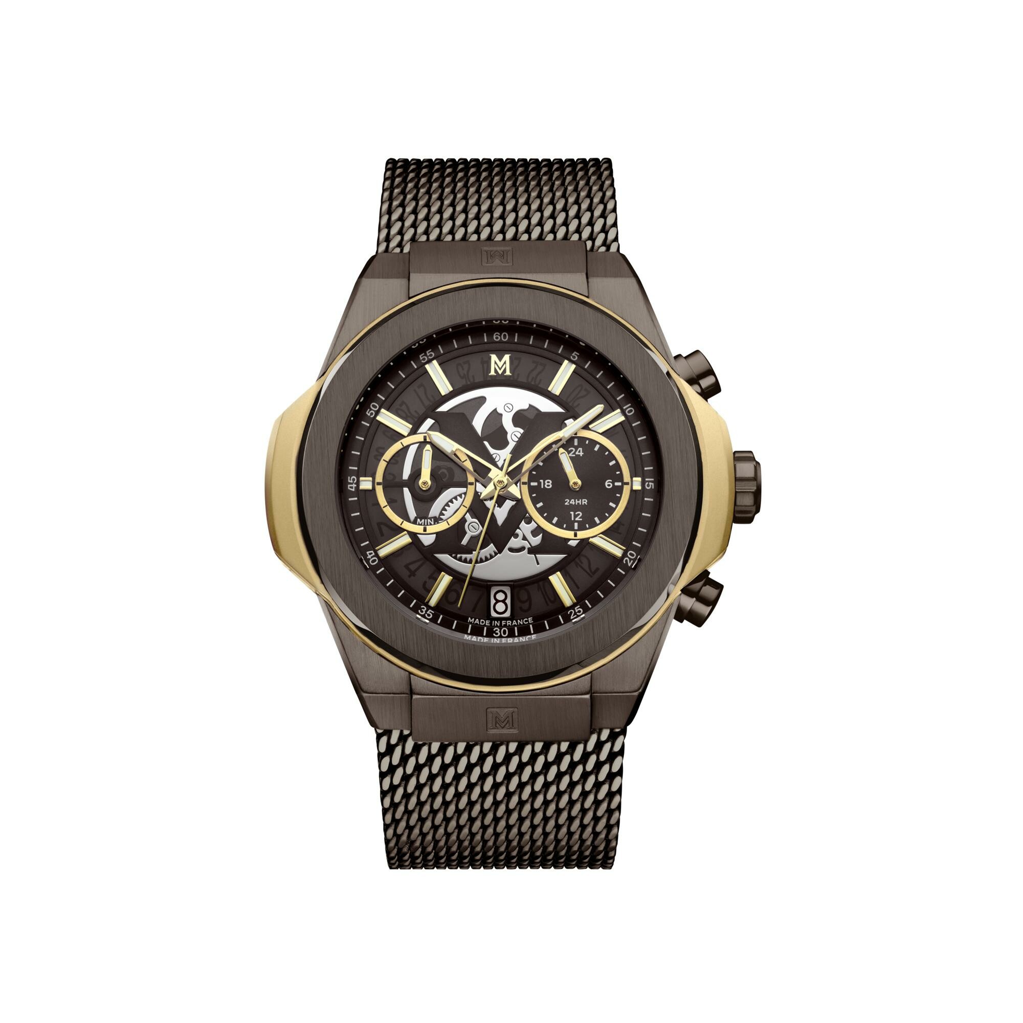La montre pour homme Montignac MOW1308 affirme un style singulier grâce à sa conception exclusive dessinée et assemblée en France. Ce garde-temps de caractère se distingue par son boîtier de 42 mm et son cadran assorti dans une teinte brun profond, offrant une esthétique à la fois sobre et sophistiquée. Son élégant bracelet en maille milanaise brun, équipé d'une boucle clip sécurisée, garantit un confort optimal et une adaptation parfaite à tous les poignets masculins.
