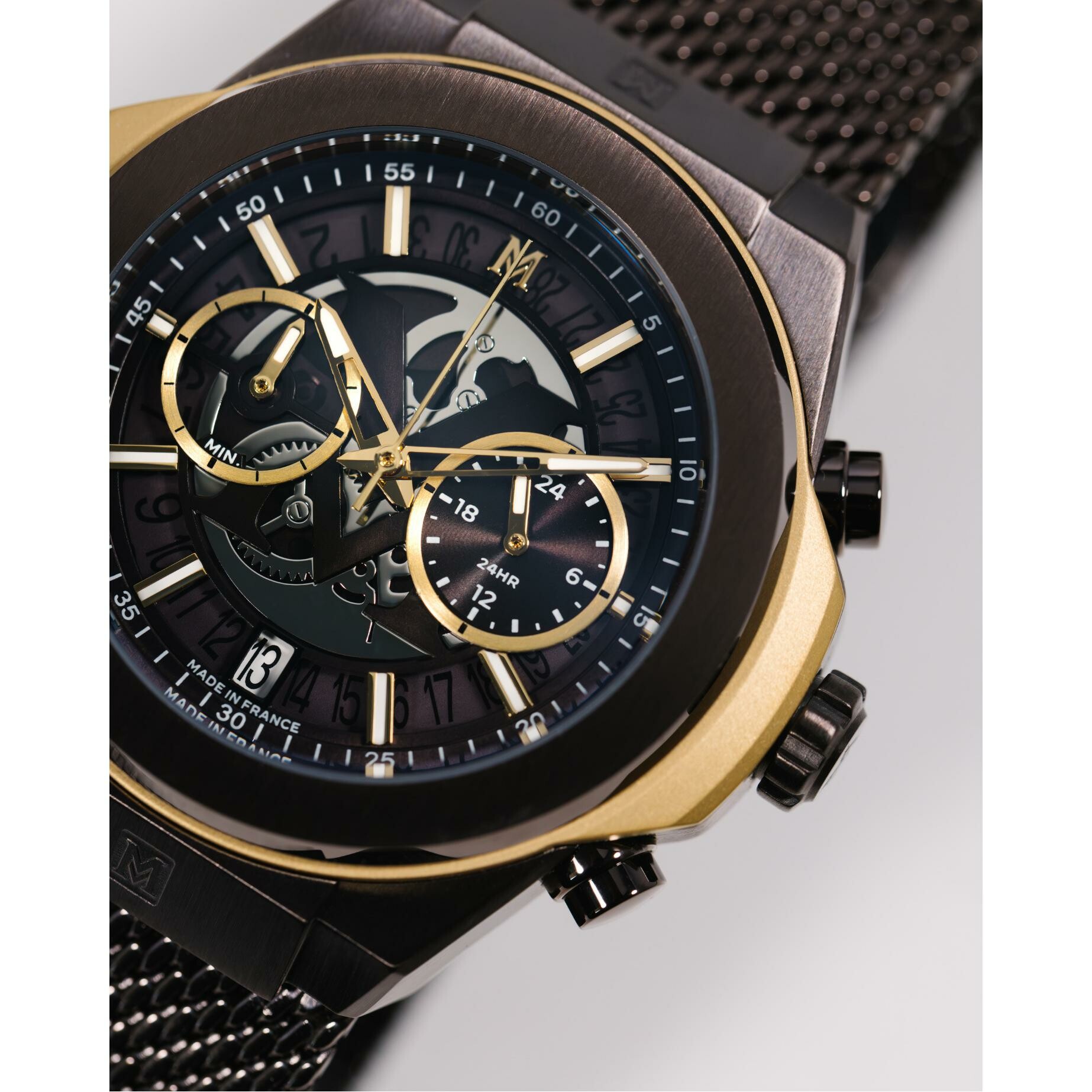 Côté performance, elle embarque un mouvement japonais TMI VK64 d'une grande précision, permettant d'afficher un chronographe central, un indicateur 24 heures ainsi qu'un guichet date discret. Cette montre Montignac combine idéalement la fiabilité technique et l'élégance française, s'imposant comme l'accessoire indispensable pour ceux qui recherchent une montre chronographe brune au design unique et moderne.