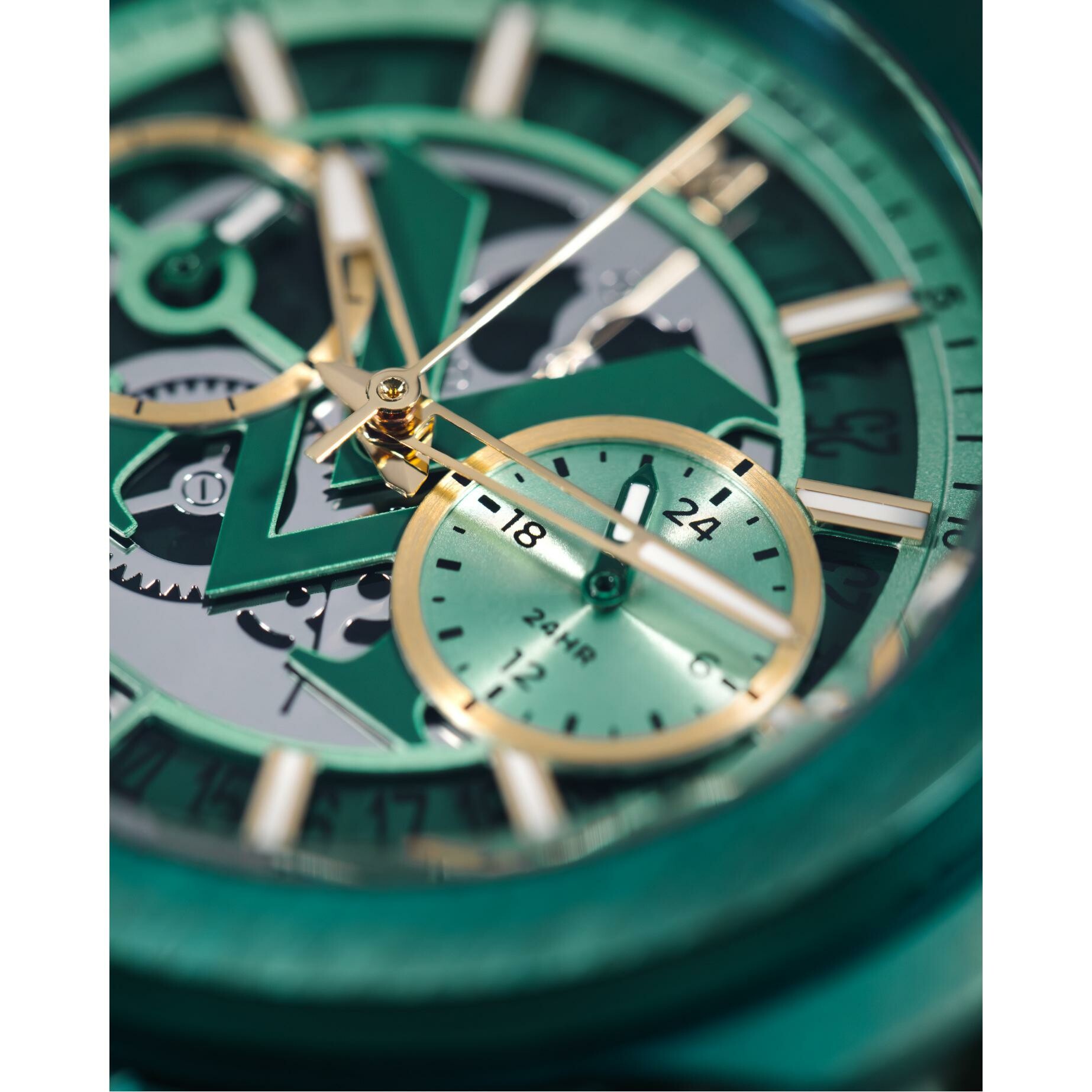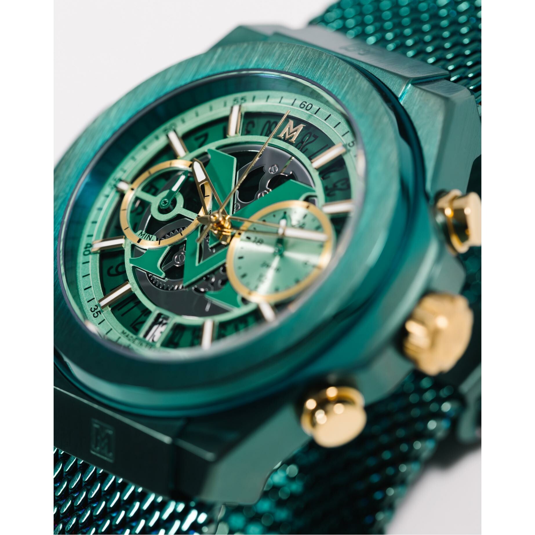 La montre pour homme Montignac MOW1309 se démarque par son esthétique audacieuse, intégralement dessinée et assemblée en France. Son boîtier de 42 mm en acier vert viridity crée un contraste saisissant avec les détails dorés du cadran, offrant un look luxueux et original. Ce garde-temps est sublimé par un bracelet en maille milanaise vert assorti, dont la boucle clip garantit un maintien sécurisé et un confort exceptionnel au quotidien.
