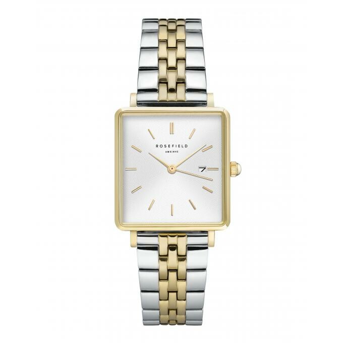 Boîtier métal doré brillant, cadran blanc avec dateur, bracelet acier bicolore doré.