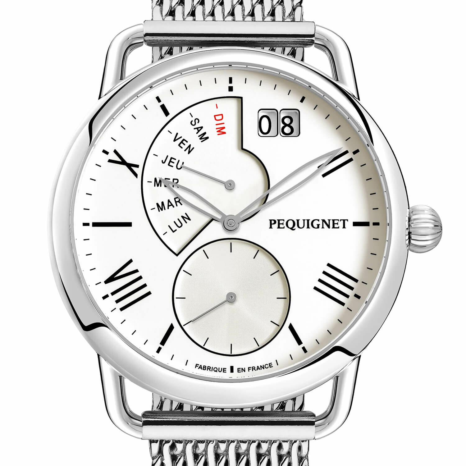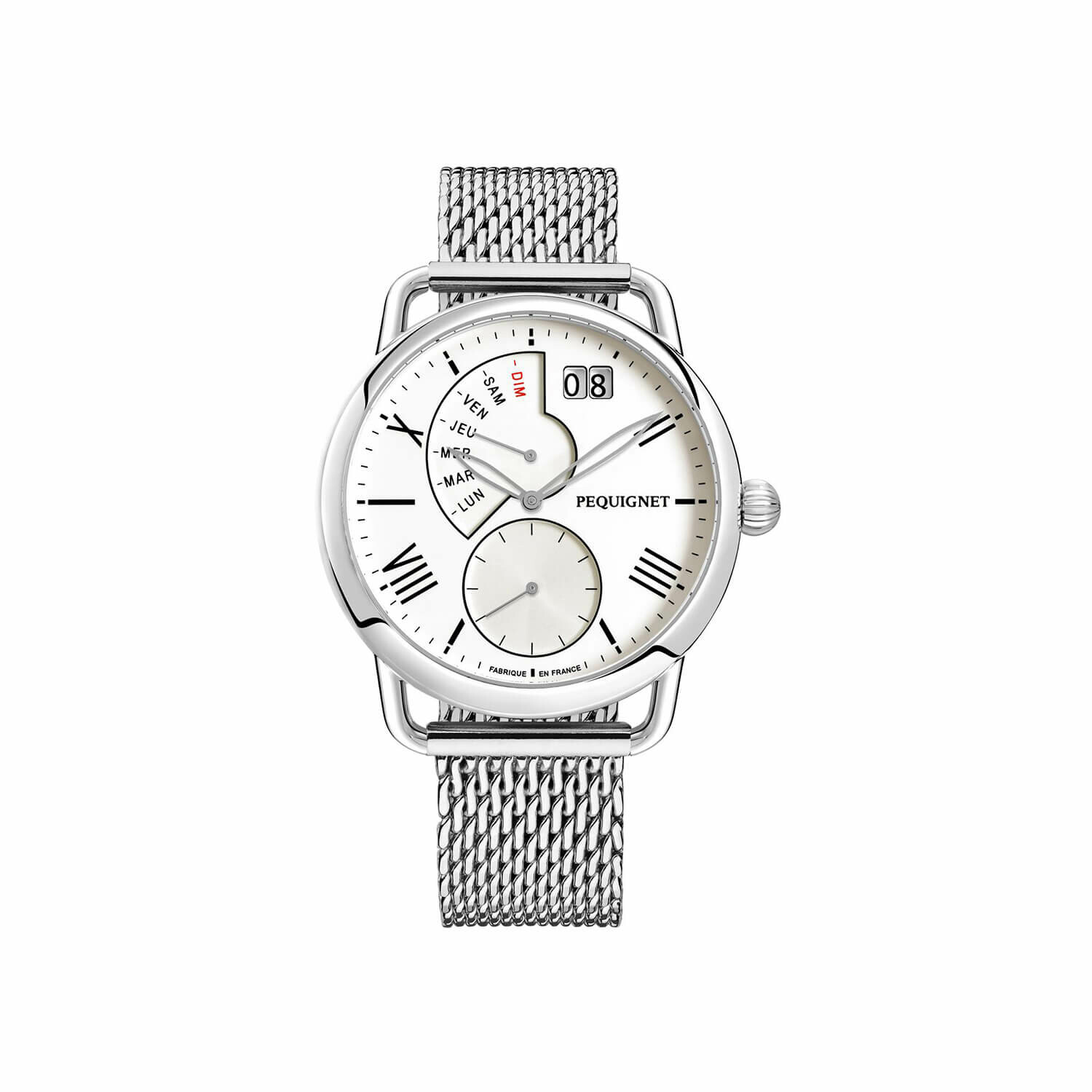 Montre à quartz pour hommes de la collection Equus de Pequignet. Le boîtier de 42 mm de diamètre et 11,50 mm d'épaisseur est en acier inoxydable 316L poli et satiné. L'indication des heures est assurée par des index ou des chiffres romains épurés. Le cadran blanc présente une petite seconde à 6 heures, l'indication du jour par aiguille rétrograde dans un guichet en arc de cercle et la date dans un double guichet carré à 1 heure. Les deux aiguilles sont blanches et ajourées. La couronne, de forme bombée et cannelée, est située à 3 heures. Le logo apparaît également à 3 heures, dans le prolongement de l'index.