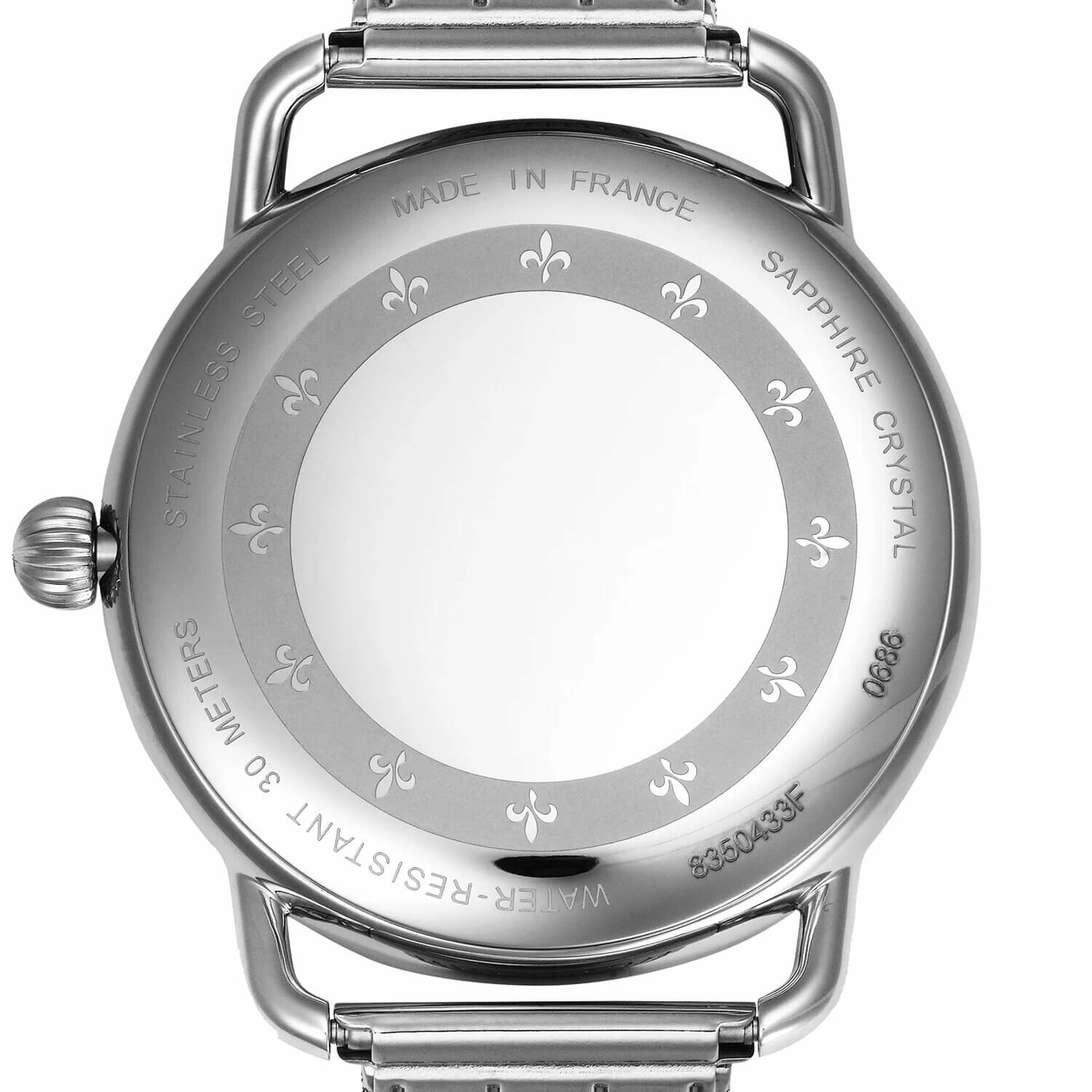 Elle est livrée avec un bracelet en cuir de veau noir qui se fixe sur un système d'entrecorne façon étrier de 20 mm. Le fermoir est une boucle déployante en acier inoxydable avec le logo gravé.