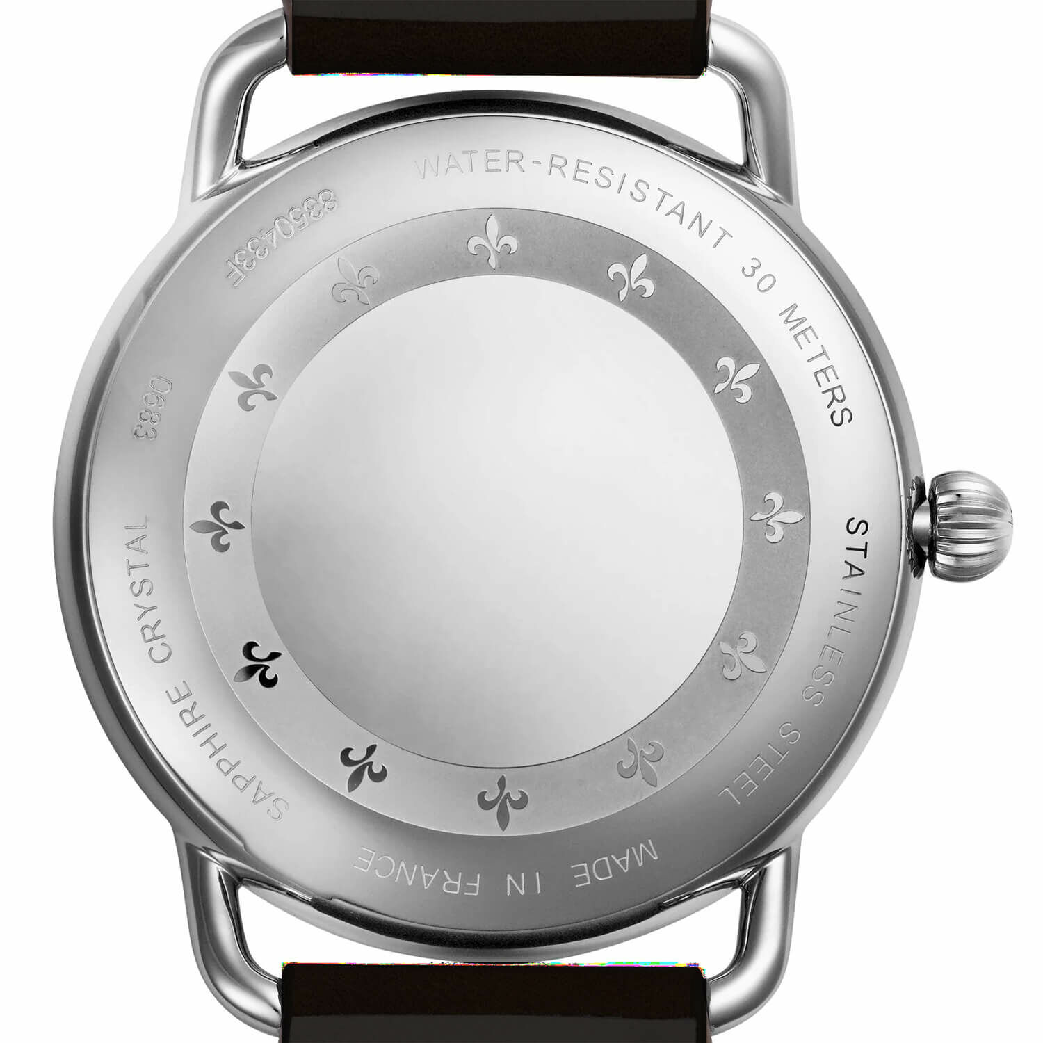 Le mouvement quartz suisse Ronda 7004.P, doté de 6 rubis, assure une précision exceptionnelle et une autonomie de 48 mois. Les aiguilles ajourées et la couronne striée à 3h renforcent le design sophistiqué de cette montre. Le bracelet en cuir de veau noir, associé à une boucle déployante papillon en acier inoxydable, offre un confort optimal.