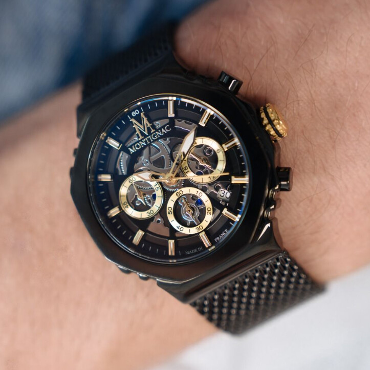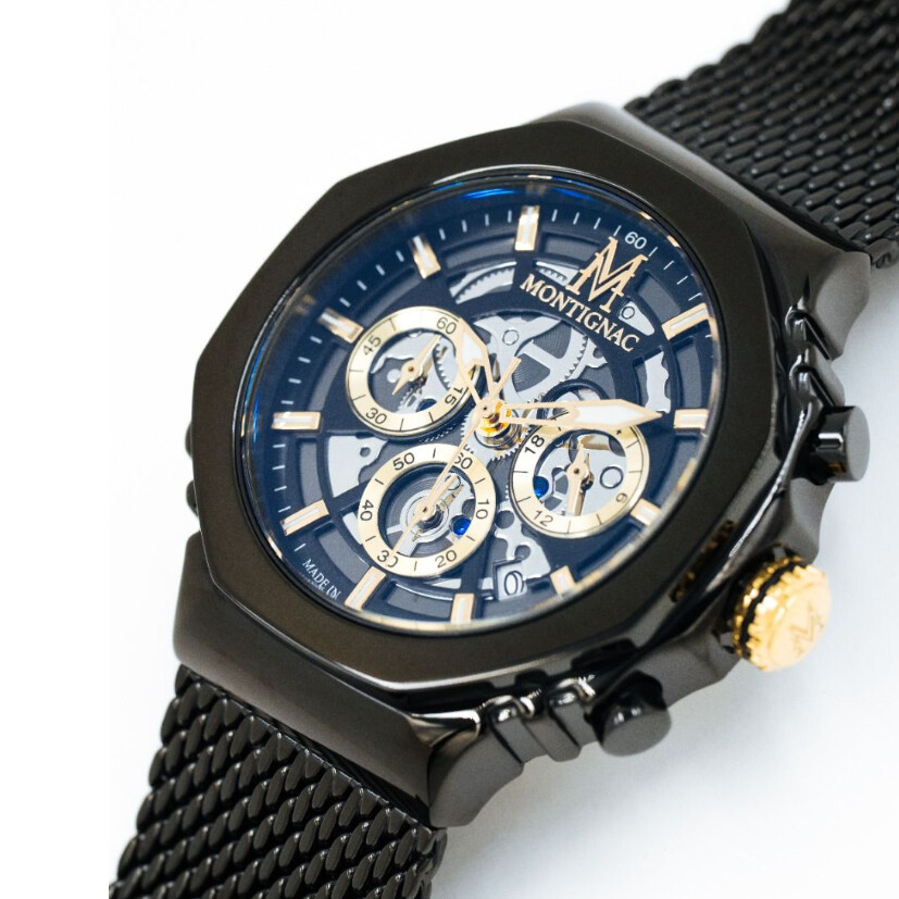 La montre MOW1205 s’impose par son boîtier octogonal en acier, une pièce forte qui redéfinit l’élégance masculine. Habillée d’un noir monochrome profond, elle arbore un cadran complexe inspiré de la haute horlogerie.